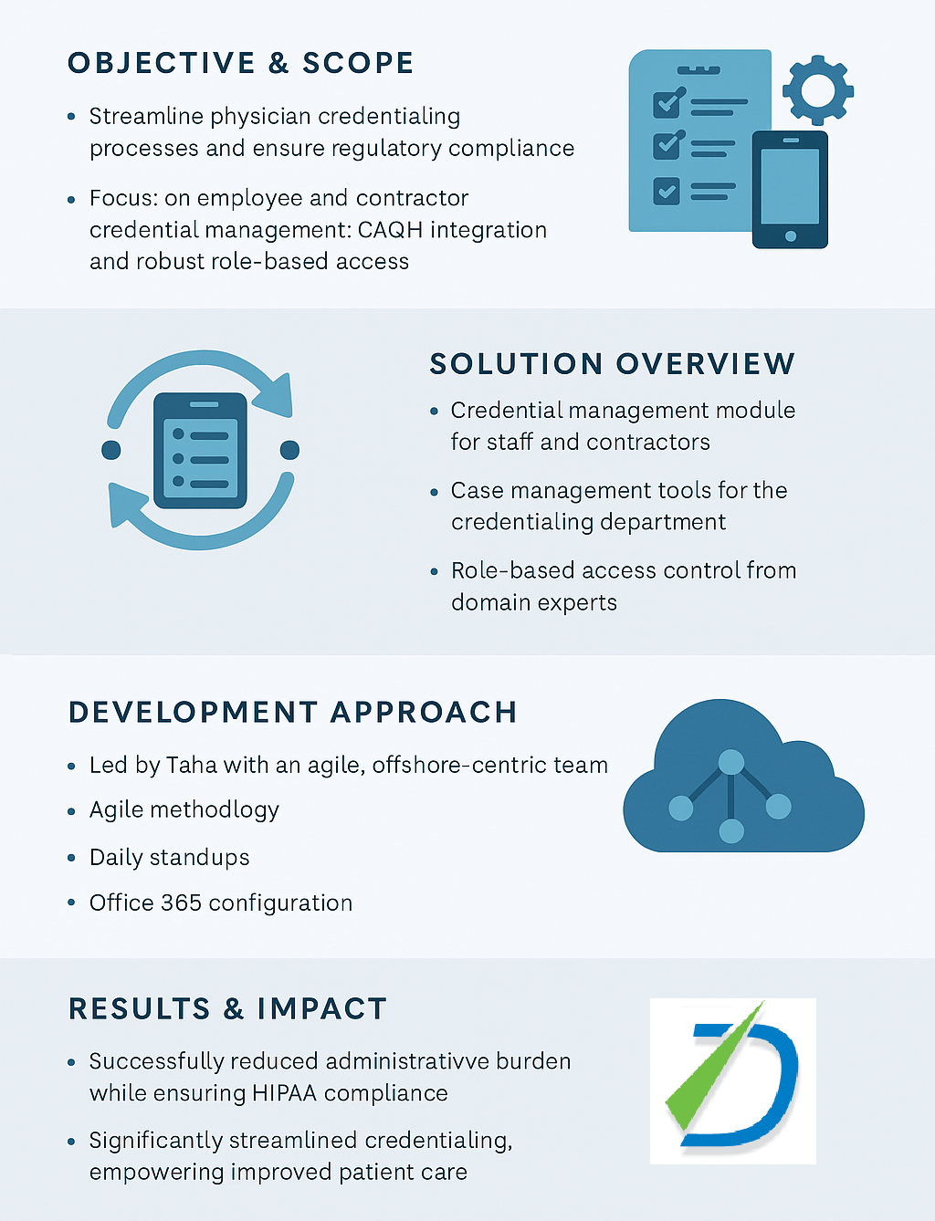 In addition to the Physician Credentialing app, Datamatix implemented Office 365 configuration for the Executive Committee and employees. This included automation of file flow, backup solutions, and document workflows to enhance productivity and collaboration within the organization.