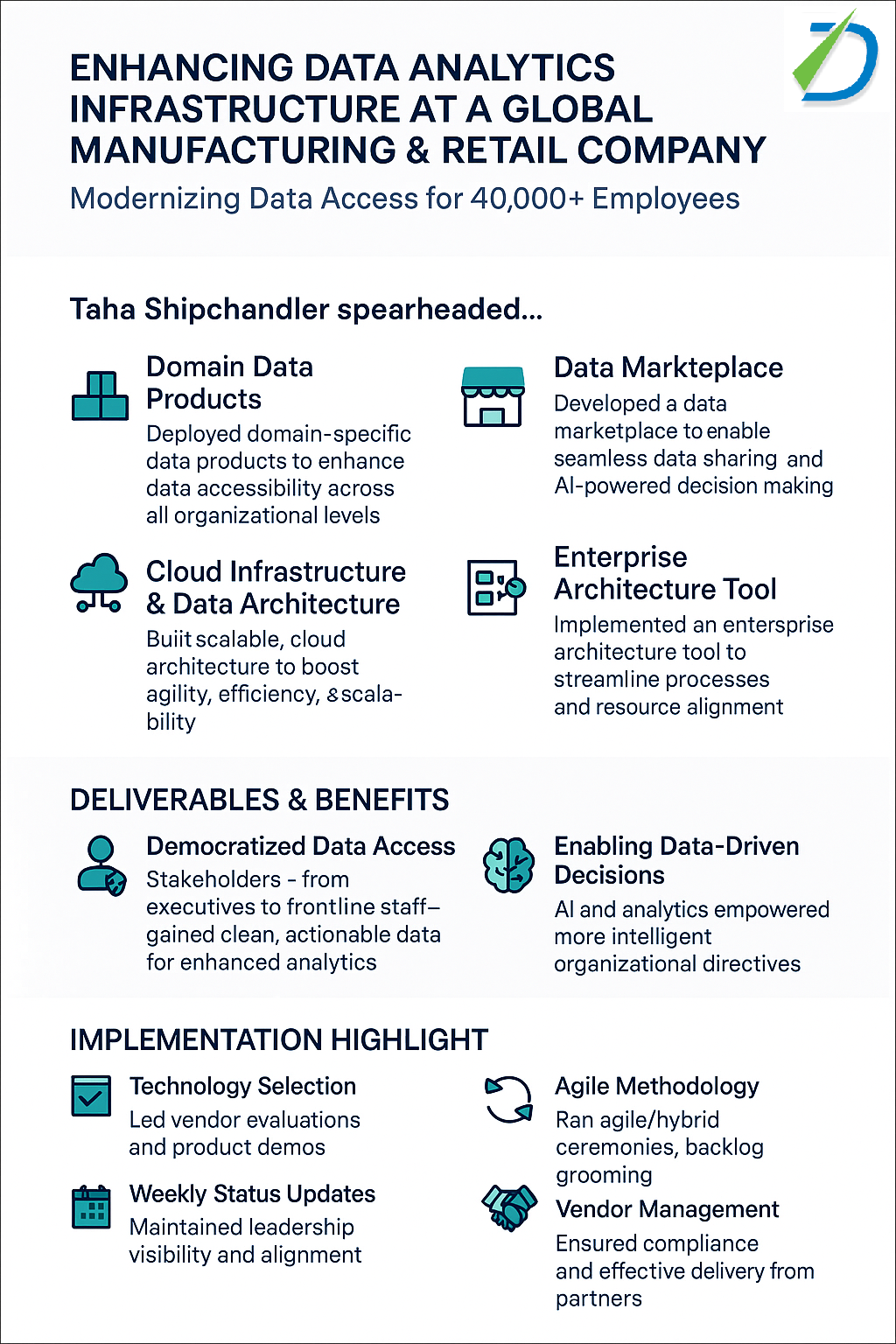 In the dynamic landscape of data analytics, Taha Shipchandler spearheaded transformative initiatives as the Project Manager for a leading global manufacturing and retailing corporation, catering to a workforce exceeding 40,000 employees. With a focus on modernizing the Data Analytics Department, Taha led the implementation of four pivotal projects: