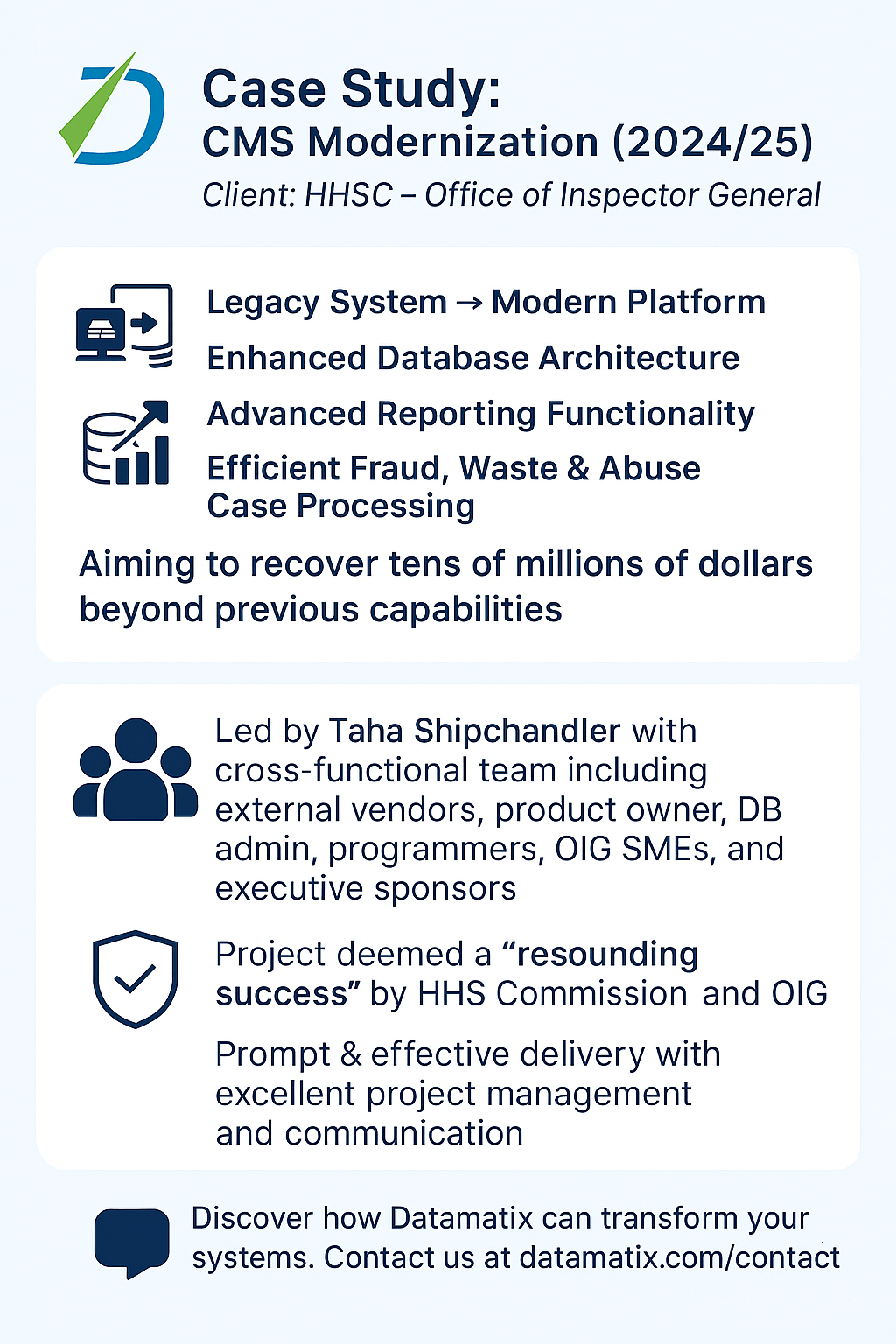 This project exemplified Datamatix Inc.'s capability to handle large-scale modernization efforts in the public sector. By transforming a critical case management system for the Office of Inspector General, the project delivered far-reaching benefits, both in financial recovery and operational efficiency. Under Taha Shipchandler’s expert management, the project not only met but exceeded its goals, setting a new benchmark for similar initiatives in the future.